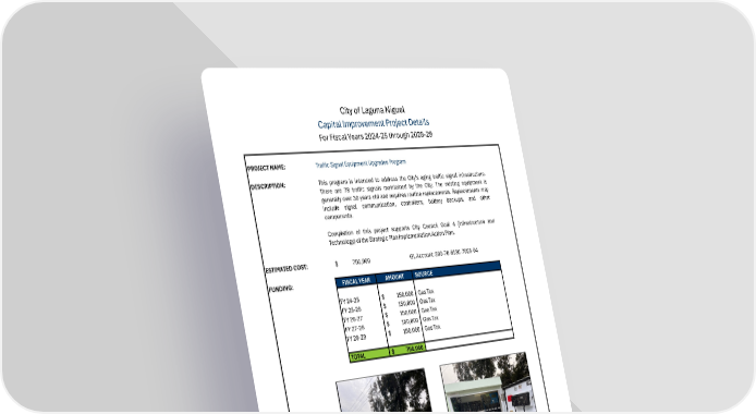 City of Laguna Niguel Capital Improvement Project Details For Fiscal Years 2024-25 through 2028-29 PROJECT NAME: Traffic Signal Equipment Upgrades Program DESCRIPTION: This program is intended to address the City's aging traffic signal infrastructure. There are 78 traffic signals maintained by the City. The existing equipment is generally over 30 years old and requires routine replacements. Replacements may include signal communication, controllers, battery backups, and other components. Completion of this project supports City Council Goal 4 (Infrastructure and Technology)oftheStrategicPlanImplementationActionPlan. ESTIMATED COST: $ 750,000 GL Account: 300-70-6130-7025-04 FUNDING: FISCAL YEAR AMOUNT SOURCE FY 24-25 $ 150, 000 Gas Tax FY 25-26 $ 150, 000 Gas Tax FY 26-27 $ 150, 000 Gas Tax FY 27-28 $ 150, 000 Gas Tax FY 28-29 $ 150, 000 Gas Tax TOTAL $ 750,000 105