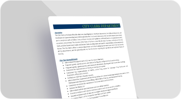 CITY CLERK DEPARTMENT Description The City Clerk is the local official for elections, local legislation, the Public Records Act, the Political Reform Act, and the Brown Act (open meeting laws). Before and after the City Council takes action, the City Clerk ensures that actions are in compliance with all federal, state, and local statutes and regulations and that all actions are properly executed, recorded, and archived. The statutes of the State of California prescribe the basic functions and duties of the City Clerk, and the Government Code and Election Code provide precise and specific responsibilities and procedures to follow. The City Clerk's office is a service department with the municipal government upon which the City Council, all City departments, and the general public rely for information regarding the operations and legislative history of the City. Prior Year Accomplishments • Administered the appointment of (2) new City Council Members. • Prepared agenda, agenda packets, and minutes for Regular and Special City Council meetings. • Prepared agenda, agenda packets, and minutes for Investment, Banking and Audit Committee meetings. • Completed the Implementation of VoteLynx meeting vote system. • Completed the implementation of NetFile, online filing system for Campaign Filing Disclosures and Statements of Economic Interests. • Fulfilled over 320 Public Records requests. • Administered the requirements of the Political Reform Act related to campaign disclosure documents, Form 700 Statement of Economic Interest filings, AB1234 Ethics Training, and Harassment Training. • Completed recruitment for vacancies on City Commissions and Committees. • Updated the Maddy List. • Administered oath to new Commission and Committee members. • Assured compliance with records retention practices at all on-site and off-site facilities. • Assured compliance with all required training for elected and appointed officials. • Engaged in Phase 1 of the Comprehensive Municipal Code Update. • Hosted (2) Vote Centers for the Presidential Primary Election. 30