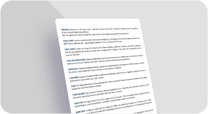 EXPENSES: Decreases in net total assets. Expenses represent total cost of operations during a period, regardless of the timing of related expenditures. FEE: The payment for direct receipt of a public service by the party who benefits from the service. FISCAL YEAR: A twelve-month period of time used for budgeting, accounting, or tax collection purposes which may differ from a calendar year. Laguna Niguel operates on a July 1 to June 30 fiscal year. FIXED ASSETS: Assets of a long-term nature such as land, buildings, machinery, furniture, and other equipment. The City has defined such assets as those with an expected life in excess of one year and an acquisition cost in excess of $10,000. FINES AND FORFEITURES: Revenue collected by the City from the issuance of misdemeanor and infraction citations which are the result of vehicle code traffic violations and municipal code parking violations. FRANCHISE: A special privilege granted by a government permitting the continuing use of public property, such as City streets, and usually involving the elements of monopoly and regulation. FUNCTION: A group of related activities aimed at accomplishing a major service or regulatory program for which a government is responsible (e.g., public safety). FUND: An independent fiscal and accounting term used to record all financial transactions related to the specific purpose for which the fund was created. FUND BALANCE: The amount of financial resources available for use. Generally, this represents a summary of all the annual operating surpluses and deficits since the fund’s inception. FUND TYPE: The highest level in the City’s budget account structure. The level includes General, Special Revenue, Capital Projects, and Internal Service. Included in each Fund Type may be several funds. GANN LIMIT: A California ballot initiative adopted in 1980, and modified by Proposition 111 which passed in 1990, to limit the amount of tax proceeds state and local governments can spend each year. It now appears in California’s State Constitution as Article XIIIB. GENERAL FUND: The primary fund of the City used to account for all revenues and expenditures of the City not legally restricted as to use. GOVERNMENTAL FUND TYPES: Funds used to account for the acquisition, use and balances of expendable financial resources and the related current liabilities -- except those accounted for in proprietary funds and fiduciary funds. In essence, these funds are accounting segregations of financial resources. GRANT: Contributions or gifts of cash or other assets from another governmental or private entity to be used or expended for a specific purpose, activity, or facility. IMPACT FEES: Fees charged to developers to cover, in whole or in part, the anticipated cost of improvements that will be necessary as a result of the development (e.g., parks, sidewalks). INFRASTRUCTURE: Facilities on which the continuance and growth of a community depend, such as roads, water lines, sewers, public buildings, parks, and so forth. 121