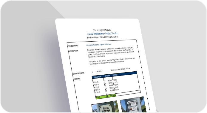 City of Laguna Niguel Capital Improvement Project Details For Fiscal Years 2024-25 through 2028-29 PROJECT NAME: Accessible Pedestrian Signal Push Buttons DESCRIPTION: This project includes the annual installation of accessible pedestrian signal (APS) push button equipment in compliance with the Americans with Disabilities Act (ADA). The APS push button equipment is eligible for Community Development BlockGrant(CDBG)funding. Completion of this project supports City Council Goal 4 (Infrastructure and Technology)oftheStrategicPlanImplementationActionPlan. ESTIMATED COST: $ 250,000 GL Account: 300-70-6130-7025-01 FUNDING: FISCAL YEAR AMOUNT SOURCE FY 24-25 $ 50, 000 CDBG FY 25-26 $ 50, 000 CDBG FY 26-27 $ 50, 000 CDBG FY 27-28 $ 50, 000 CDBG FY 28-29 $ 50, 000 CDBG TOTAL $ 250,000 BEFORE AFTER 102