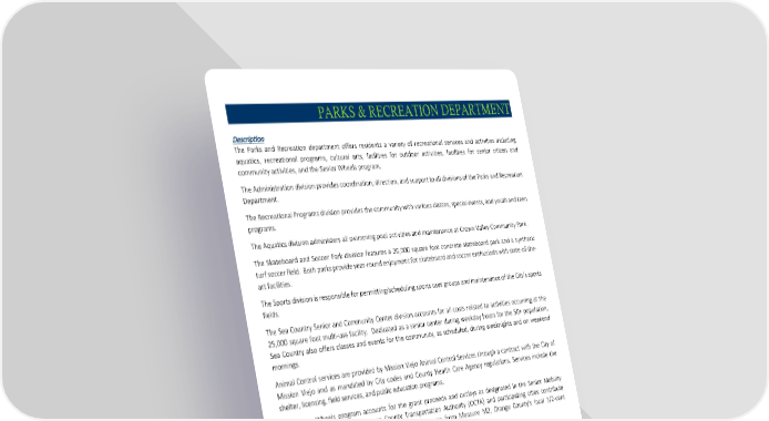 PARKS & RECREATION DEPARTMENT Description The Parks and Recreation department offers residents a variety of recreational services and activities including aquatics, recreational programs, cultural arts, facilities for outdoor activities, facilities for senior citizen and community activities, and the Senior Wheels program. The Administration division provides coordination, direction, and support to all divisions of the Parks and Recreation Department. The Recreational Programs division provides the community with various classes, special events, and youth and teen programs. The Aquatics division administers all swimming pool activities and maintenance at Crown Valley Community Park. The Skateboard and Soccer Park division features a 20,000 square foot concrete skateboard park and a synthetic turf soccer field. Both parks provide year-round enjoyment for skateboard and soccer enthusiasts with state-of-the- art facilities. The Sports division is responsible for permitting/scheduling sports user groups and maintenance of the City’s sports fields. The Sea Country Senior and Community Center division accounts for all costs related to activities occurring at the 25,000 square foot multi-use facility. Dedicated as a senior center during weekday hours for the 50+ population, Sea Country also offers classes and events for the community, as scheduled, during weeknights and on weekend mornings. Animal Control services are provided by Mission Viejo Animal Control Services through a contract with the City of Mission Viejo and as mandated by City codes and County Health Care Agency regulations. Services include the shelter, licensing, field services, and public education programs. The Senior Wheels program accounts for the grant proceeds and outlays as designated in the Senior Mobility Program (SMP) grant. The Orange County Transportation Authority (OCTA) and participating cities contribute financially to the program. Funding for the SMP comes from Measure M2, Orange County's local 1/2-cent transportation sales tax measure. Prior Year Accomplishments • Updated the Laguna Niguel Aquatics Center Facility Use Policy and Fees. • Revised the Athletic Facility use Policy and Fee Structure to include new user groups, increased fees for non- residents and competitive use, and included an athletics facility code of conduct. • Contract classes at the Sea Country Senior and Community Center had a total attendance of 4,157, an increase of 56% from 2022. • Enhanced and improved Senior Wheels program in December 2023. • Initiated the Trail Education Program hosting nine trail educations days. • Hosted 296 billable rentals at the Crown Valley Community center surpassing projections for the second consecutive year. 76