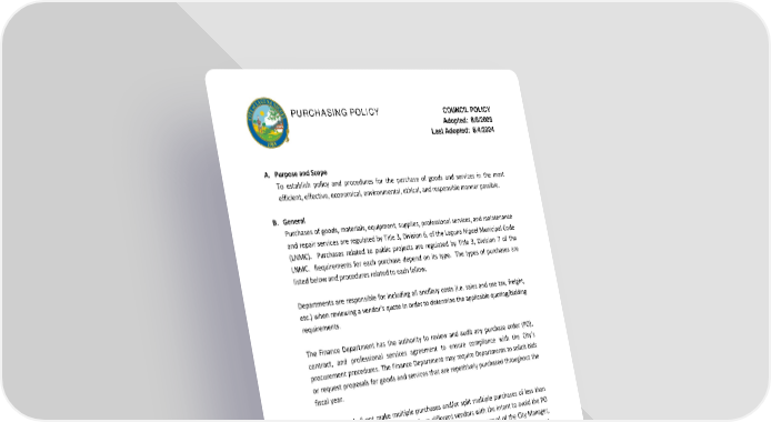 PURCHASING POLICY COUNCIL POLICY Adopted: 8/8/2006 Last Adopted: 6/4/2024 A. Purpose and Scope To establish policy and procedures for the purchase of goods and services in the most efficient, effective, economical, environmental, ethical, and responsible manner possible. B. General Purchases of goods, materials, equipment, supplies, professional services, and maintenance and repair services are regulated by Title 3, Division 6, of the Laguna Niguel Municipal Code (LNMC). Purchases related to public projects are regulated by Title 3, Division 7 of the LNMC. Requirements for each purchase depend on its type. The types of purchases are listed below and procedures related to each follow. Departments are responsible for including all ancillary costs (i.e. sales and use tax, freight, etc.) when reviewing a vendor’s quote in order to determine the applicable quoting/bidding requirements. The Finance Department has the authority to review and audit any purchase order (PO), contract, and professional services agreement to ensure compliance with the City’s procurement procedures. The Finance Department may require Departments to solicit bids or request proposals for goods and services that are repetitively purchased throughout the fiscal year. Employees shall not make multiple purchases and/or split multiple purchases of less than $3,000.00 from the same vendor or from different vendors with the intent to avoid the PO or contract requirement. Except in an emergency, with the approval of the City Manager, no employee of the City shall request a supplier to deliver goods, material, equipment, supplies, professional or non-professional services to the City unless a PO and/or contract has been issued by the Finance Department according to the requirements of this Policy. C. Procedures 1. Local Merchant Preference City of Laguna Niguel (City) staff shall make every attempt to purchase supplies and equipment from City businesses whenever practicable. LNMC 3-6-2(b)(1), establishes a local merchant purchasing preference in the form of a one-percent PURCHASING POLICY Page 1 of 10 COUNCIL POLICY LAST ADOPTED 6/4/2024 135