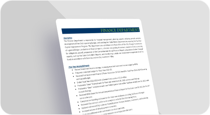 FINANCE DEPARTMENT Description The Finance Department is responsible for financial management, planning support, including periodic analysis, development of the City's operating budget, and assisting the Public Works Department in preparing the Five-Year Capital Improvement Program. The department also administers the fiscal affairs of the City through maintenance of a general ledger; production of financial reports; collection and posting of revenues; payment of and accounting for obligations; payroll; preparation of the Comprehensive Annual Financial Report; preparation of other financial reports, such as the State Controller's Reports; and maintaining custody and investment management of all City funds in accordance with State law and the City Investment Policy. Prior Year Accomplishments • Revised Investment Income strategy, increasing expected investment income budget by 494%. • Prepared a balanced budget for Fiscal Year 2024-25. • Received first Government Finance Officers Association (GFOA) Award for Fiscal Year 2023-2024 Operating and Capital Budget. • Ended Fiscal Year 2022-2023 with a General Fund surplus of $1.8 million. • Produced a “clean” financial audit for fiscal year ended June 30, 2023, with no audit findings. • Produced a “clean” compliance audit over federal grants received for fiscal year ended June 30, 2023, with no audit findings. rd • Received GFOA Award for Annual Comprehensive Financial Report for fiscal year June 30, 2022, for the 23 consecutive year. • Completed on-boarding and transition for three new employees, including the Finance Manager. • Reviewed City contracts and ensured compliance with the City’s Purchasing Policy. • Updated and revised City’s primary financial policies: Financial Reserves, Investment, and Purchasing. • Increased volume of virtual payments to vendors. • Captured additional credit card rebates via virtual payments. • Implemented various cost-saving measures via early payment discounts: Credit Card payments. OC Sherrif early payment. OCTA SMP Program. 38