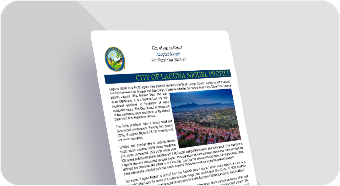 City of Laguna Niguel Adopted Budget For Fiscal Year 2024-25 CITY OF LAGUNA NIGUEL PROFILE Laguna Niguel is a 14.72 square mile planned community in South Orange County, California and is located halfway between Los Angeles and San Diego. It is surrounded by the cities of Aliso Viejo, Dana Point, Laguna Beach, Laguna Hills, Mission Viejo and San Juan Capistrano. It is a General Law city with municipal elections in November of even numbered years. The City Council is comprised of five members, each elected on a “by-district” basis from their respective district. The City’s residents enjoy a strong retail and commercial environment. Seventy two percent (72%) of Laguna Niguel’s 26,187 housing units are owner occupied. Existing and planned use of Laguna Niguel’s 9,456 acres includes 3,549 acres residential, 276 acres commercial, 223 acres mixed uses, 222 acres public/institutional facilities and 3,650 acres designated to parks and open space. Over one-third of Laguna Niguel is designated as open space. This significant amount of open space is one of the key features defining the character and urban form of the City. The City has two community parks, 23 neighborhood parks, three mini-parks, one dog park, two county regional parks, two small county parks, and a skate park. The name “Laguna Niguel” is derived from the Spanish word “Laguna,” which means lagoon, and the word “Nigueli,” which was the name of a Juaneno Indian village once located near Aliso Creek. In 1821, California became Mexican territory and many rancheros were formed in Southern California, including Rancho Niguel. During this period, Rancho Niguel was primarily used as a sheep ranch. The first private landowner of the area was Juan Avila, a resident of San Juan Capistrano, who obtained land through a Mexican land grant in 1842. Juan Avila was also successful in re- establishing his title to the land after California became US territory in 1848 and remained the owner of “Rancho Niguel” until 1865. In 1895, the “Rancho Niguel” land became part of the Moulton Company, a company that would eventually control over 19,000 acres of local ranch land. The genesis of today’s Laguna Niguel was the establishment of the Laguna Niguel Corporation in 1959 by Cabot, Cabot and Forbes. Laguna Niguel was one of the first master planned communities in California. 1