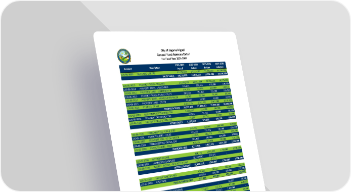 City of Laguna Niguel General Fund Revenue Detail For Fiscal Year 2024‐2025 2021‐2022 2022‐2023 2023‐2024 2024‐2025 Account Description Actual Actual Budget Adopted 100‐06‐3000 SALES AND USE TAX 14,518,028 14,818,183 15,026,000 14,950,000 SALES TAXES 14,518,028 14,818,183 15,026,000 14,950,000 100‐06‐3010 PROPERTY TAXES ‐ SECURED 17,046,878 18,021,981 18,550,000 19,075,000 100‐06‐3011 PROPERTY TAXES ‐ UNSECURED 545,694 538,841 678,000 720,000 100‐06‐3012 PROPERTY TAXES ‐ SUPPLEMENTAL 396,206 777,896 123,000 528,013 100‐06‐3013 PROPERTY TAXES ‐ PUBLIC UTILITY 214,380 252,316 222,000 263,484 100‐06‐3014 PROPERTY TAXES ‐ HOMEOWNER RELIEF 78,785 79,884 76,000 85,088 100‐06‐3015 PROPERTY TAXES ‐ OTHER 44,376 58,764 43,000 62,592 100‐06‐3020 PT IN LIEU OF VLF 6,966,335 7,342,775 7,607,000 8,109,783 PROPERTY TAXES 25,292,654 27,072,457 27,299,000 28,843,960 100‐06‐3030 REAL PROPERTY TRANSFER TAX 1,019,060 524,168 500,000 500,000 100‐06‐3040 TRANSIENT OCCUPANCY TAX 66,693 79,755 70,000 85,000 100‐06‐3100 MOTOR VEHICLE LICENSE FEE 75,286 66,153 75,000 75,000 OTHER TAXES 1,161,039 670,076 645,000 660,000 100‐ 06‐3200 FRANCHISE FEES ‐ COX & AT&T 945,030 853,444 900,000 750,000 100‐06‐3201 FRANCHISE FEES ‐ SDG&E 595,285 720,737 730,000 820,000 100‐06‐3202 FRANCHISE FEES ‐ SO CAL EDISON 144,645 182,773 150,000 215,000 100‐06‐3203 FRANCHISE FEES ‐ SO CAL GAS 181,453 201,493 225,000 240,000 100‐06‐3204 FRANCHISE FEES ‐ CR&R 406,495 491,881 470,000 525,000 FRANCHISE FEES 2,272,908 2,450,328 2,475,000 2,550,000 100‐06‐3700 INTEREST INCOME 321,176 1,043,599 1,730,000 1,550,000 100‐06‐3702 UNREALIZED GAIN/LOSS (2,168,450) 209,870 ‐ ‐ 100‐06‐3704 INTEREST INCOME ‐ RESTRICTED CASH (125,080) 87,514 ‐ ‐ INTEREST INCOME (1,972,354) 1,340,983 1,730,000 1,550,000 100‐10‐3400 MOTOR VEHICLE FINES 424,630 206,162 330,000 330,000 100‐10‐3402 CITATIONS 177,054 194,704 165,000 175,000 FINES & FORFEITURES 601,684 400,866 495,000 505,000 100‐20‐3820 MISCELLANEOUS REVENUE ‐ ‐ 62,000 76,000 100‐21‐3312 ENTITLEMENT PLANNING FEES 174,255 112,311 92,800 110,000 100‐21‐3315 TRAFFIC IMPACT FEES 349,002 227,610 2,100,000 ‐ 100‐21‐3316 ENTITLEMENT PROF. SVS REIMB. 330,966 528,250 165,000 94,500 100‐21‐3318 POST‐ENTITLEMENT PROF. SVS REIMB. ‐ ‐ 18,500 30,800 100‐21‐3319 POST‐ENTITLEMENT PLANNING FEEES ‐ ‐ 23,350 32,300 100‐21‐3710 RENTS ‐ CELL TOWERS 451,984 448,096 437,425 337,082 100‐21‐3820 MISCELLANEOUS REVENUE ‐ 10 62,200 76,200 100‐22‐3310 BUILDING & SAFETY FEES 2,738,939 2,582,600 3,100,000 2,750,000 100‐22‐3311 GRADING & HYDRO./W.Q. FEES 48,992 5,402 ‐ ‐ 100‐22‐3313 GRADING & HYDRO./W.Q. REIMB. 88,095 191,015 220,000 295,000 100‐22‐3314 FIRE ADMINISTRATION FEES 54 ‐ 200 200 100‐22‐3820 MISCELLANEOUS REVENUE 20 40 200 200 100‐25‐3402 CITATIONS 10,528 9,128 8,500 7,000 COMMUNITY DEVELOPMENT REVENUE 4,192,835 4,104,462 6,290,175 3,809,282 100‐29‐3140 OPERATING GRANTS ‐ 48,420 ‐ ‐ 100‐29‐3180 RECYCLING PROGRAM 40,797 78,411 16,500 30,000 100‐ 29‐3320 ENCROACHMENT FEES 222,163 231,125 200,000 475,000 100‐29‐3321 TRANSPORTATION FEES 5,224 3,732 4,000 10,000 15