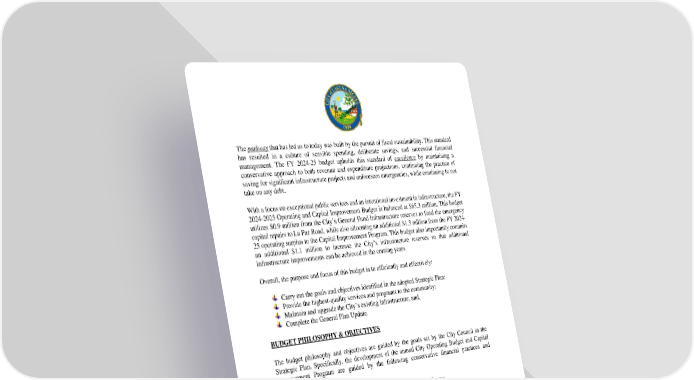 The pathway that has led us to today was built by the pursuit of fiscal sustainability. This standard has resulted in a culture of sensible spending, deliberate savings, and successful financial management. The FY 2024-25 budget upholds this standard of excellence by maintaining a conservative approach to both revenue and expenditure projections, continuing the practice of saving for significant infrastructure projects and unforeseen emergencies, while continuing to not take on any debt. With a focus on exceptional public services and an intentional investment in infrastructure, the FY 2024-2025 Operating and Capital Improvement Budget is balanced at $65.3 million. This budget utilizes $0.9 million from the City’s General Fund Infrastructure reserves to fund the emergency capital repairs to La Paz Road, while also allocating an additional $1.3 million from the FY 2024- 25 operating surplus to the Capital Improvement Program. This budget also importantly commits an additional $1.1 million to increase the City’s infrastructure reserves so that additional infrastructure improvements can be achieved in the coming years. Overall, the purpose and focus of this budget is to efficiently and effectively: Carry out the goals and objectives identified in the adopted Strategic Plan; Provide the highest-quality services and programs to the community; Maintain and upgrade the City’s existing infrastructure; and, Complete the General Plan Update. BUDGET PHILOSOPHY & OBJECTIVES The budget philosophy and objectives are guided by the goals set by the City Council in the Strategic Plan. Specifically, the development of the annual City Operating Budget and Capital Improvement Program are guided by the following conservative financial practices and philosophies: Balanced General Fund revenues and operating expenditures; The General Fund budget includes an operating contingency reserve to cover unanticipated revenue losses, expenditure increases and mid-year budget adjustments; The General Fund budget also includes a capital contingency reserve for emergency capital infrastructure needs; If necessary, General Fund Reserves could be utilized for specific capital improvement projects and/or multi-year projects that do not have another funding source; and, To purposely save for and allocate funding for current and future capital and infrastructure projects and/or emergencies. ii