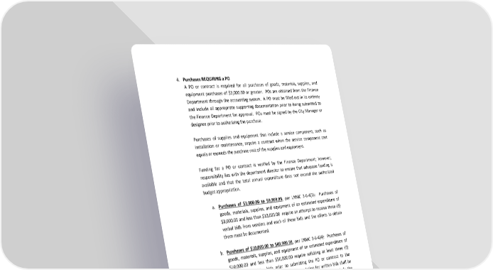 4. Purchases REQUIRING a PO A PO or contract is required for all purchases of goods, materials, supplies, and equipment purchases of $3,000.00 or greater. POs are obtained from the Finance Department through the accounting system. A PO must be filled out in its entirety and include all appropriate supporting documentation prior to being submitted to the Finance Department for approval. POs must be signed by the City Manager or designee prior to authorizing the purchase. Purchases of supplies and equipment that include a service component, such as installation or maintenance, require a contract when the service component cost equals or exceeds the purchase cost of the supplies and equipment. Funding for a PO or contract is verified by the Finance Department; however, responsibility lies with the department director to ensure that adequate funding is available and that the total annual expenditure does not exceed the authorized budget appropriation. a. Purchases of $3,000.00 to $9,999.99, per LNMC 3-6-4(3): Purchases of goods, materials, supplies, and equipment of an estimated expenditure of $3,000.00 and less than $10,000.00 require an attempt to receive three (3) verbal bids from vendors and each of these bids and the efforts to obtain them must be documented. b. Purchases of $10,000.00 to $49,999.99, per LNMC 3-6-4(4): Purchases of goods, materials, supplies, and equipment of an estimated expenditure of $10,000.00 and less than $50,000.00 require soliciting at least three (3) written competitive bids prior to submitting the PO or contract to the Finance Department for approval. Documentation for written bids shall be attached to the PO. Documentation for written bids should include the following: i. Vendor information such as business name, contact person, phone number, etc. ii. Quote details such as the total amount proposed, shipping information, and the date the quote was received. (For reorders, the Purchasing Manager shall review and confirm the written bids.) PURCHASING POLICY Page 3 of 10 COUNCIL POLICY LAST ADOPTED 6/4/2024 137