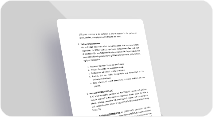 (1%) price advantage in the evaluation of bids or proposals for the purchase of goods, supplies, and equipment subject to sales and use tax. 2. Environmental Preference City staff shall make every effort to purchase goods that are environmentally responsible. Per LNMC 3-6-2(b)(3), departments shall purchase and use goods made of recycled and/or recyclable materials whenever practicable. Departments shall be aware of the following environmental guidelines when purchasing goods, materials, equipment or supplies: a. Equipment that meets Energy Star specifications b. Products that contain non-hazardous materials c. Products that will not emit harmful air emissions d. Products that are readily bio-degradable and non-persistent in the environment after its use e. Keep informed of current developments in market conditions and new products. 3. Purchases NOT REQUIRING a PO A PO is not required for purchases less than $3,000.00; however, such purchases must be approved by the appropriate department director before the order is placed. Soliciting competitive bids is not required; however, staff is encouraged to seek competition when possible to support the effort of obtaining optimum pricing for the City. a. Purchases of $100.00 or less, per LNMC 3-6-4(1): Departments may utilize petty cash or a credit card for purchases up to $100.00; however, employees shall make every attempt to use their City-issued procurement card. Justification for the use of petty cash must be documented on the cash receipt. b. Purchases of $100.01 to $2,999.99, per LNMC 3-6-4(2): A department director may authorize purchases over $100.00 and less than $3,000.00 without issuing a PO or contract. Employees may use their City-issued procurement card to make the purchase, or may request that the City be invoiced through its existing accounts payable/cash disbursement process. PURCHASING POLICY Page 2 of 10 COUNCIL POLICY LAST ADOPTED 6/4/2024 136