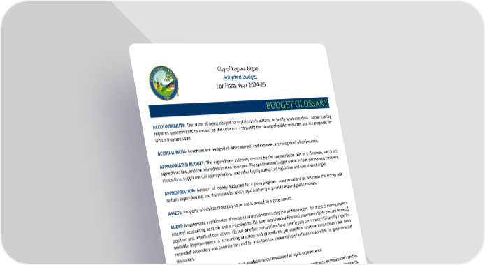 City of Laguna Niguel Adopted Budget For Fiscal Year 2024-25 BUDGET GLOSSARY ACCOUNTABILITY: The state of being obliged to explain one’s actions, to justify what one does. Accountability requires governments to answer to the citizenry -- to justify the raising of public resources and the purposes for which they are used. ACCRUAL BASIS: Revenues are recognized when earned, and expenses are recognized when incurred. APPROPRIATED BUDGET: The expenditure authority created by the appropriation bills or ordinances, which are signed into law, and the related estimated revenues. The appropriated budget would include all reserves, transfers, allocations, supplemental appropriations, and other legally authorized legislative and executive changes. APPROPRIATION: Amount of money budgeted for a given program. Appropriations do not mean the money will be fully expended but are the means by which legal authority is given to expend public monies. ASSETS: Property which has monetary value and is owned by a government. AUDIT: A systematic examination of resource utilization concluding in a written report. It is a test of management’s internal accounting controls and is intended to: (1) ascertain whether financial statements fairly present financial position and results of operations; (2) test whether transactions have been legally performed; (3) identify areas for possible improvements in accounting practices and procedures; (4) ascertain whether transactions have been recorded accurately and consistently; and (5) ascertain the stewardship of officials responsible for governmental resources. BALANCED BUDGET: A budget in which available resources exceed or equal expenditures. BASIS OF ACCOUNTING/BUDGETING: A term used to refer to when revenues, expenditures, expenses and transfers – and the related assets and liabilities – are recognized in the accounts and reported in the financial statements. The City utilizes the modified accrual basis of accounting for the General Fund and all other Governmental Funds, and the accrual basis of accounting for the Vehicle Replacement Internal Service Fund. BUDGET: A plan of financial and program operation which lists appropriations and the means of financing them for a given time period. BUDGET ADOPTION: Formal adoption by the City Council which sets the spending path for the year. BUDGET CALENDAR: The schedule of key dates or milestones that a government follows in the preparation and adoption of the budget. BUDGETARY CONTROL: The control or management of a government or enterprise in accordance with an approved budget for the purpose of keeping expenditures within the limitations of available appropriations and revenues. 119
