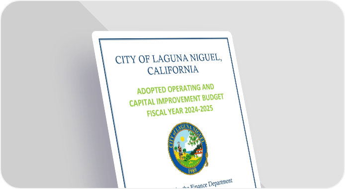 CITY OF LAGUNA NIGUEL, CALIFORNIA ADOPTED OPERATING AND CAPITAL IMPROVEMENT BUDGET FISCAL YEAR 2024-2025 Prepared by the Finance Department In Collaboration with: Tamara S. Letourneau City Manager Justin J. Martin Assistant City Manager Jacki Scott Public Works Director