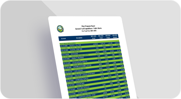 City of Laguna Niguel General Fund Expenditure ‐ Public Works For Fiscal Year 2024‐2025 2021‐2022 2022‐2023 2023‐2024 2024‐2025 Account Description Actual Actual Budget Adopted Public Works Administration 100‐29‐4000 SALARIES ‐ FULL‐TIME 1,280,996 1,478,735 1,174,158 1,504,502 100‐29‐4002 SALARIES ‐ PART‐TIME 52,411 49,349 59,280 42,600 100‐29‐4003 SALARIES ‐ OVER‐TIME 3,821 9,081 1,000 1,000 100‐29‐4020 TEMPORARY HELP 43,977 6,873 ‐ ‐ 100‐29‐4030 RETIREMENT 143,922 154,867 144,284 178,484 100‐29‐4031 EMPLOYEE INSURANCE BENEFITS 173,021 165,513 120,720 162,924 100‐29‐4032 DISABILITY INSURANCE 7,097 8,205 7,088 8,832 100‐29‐4034 PAYROLL TAXES 22,918 25,902 21,605 25,089 100‐29‐4035 OTHER EMPLOYEE BENEFITS 8,320 6,323 5,700 5,700 100‐29‐5007 BANK/NSF CHARGES 4,747 120 ‐ ‐ 100‐29‐5040 CLOTHING & PERSONNEL SUPPLIES 8,689 21,520 11,000 9,000 100‐29‐5080 COMPUTER SOFTWARE 23,002 18,549 30,000 42,000 100‐29‐5170 FLEET GASOLINE 69,861 62,315 70,000 73,080 100‐29‐5180 FLEET MAINTENANCE 77,488 45,941 75,000 76,200 100‐29‐5300 EQUIPMENT ‐ LEASES & MAINTENANCE 11,446 12,283 14,000 14,000 100‐29‐5440 MEMBERSHIPS & DUES 1,143 1,751 1,500 2,000 100‐29‐5460 OPERATIONAL SUPPLIES 13,180 14,419 15,000 15,000 100‐29‐5500 PRINTING & MAILING 54,259 68,556 8,000 8,000 20,000 20,000 100‐29‐5520 PROMOTIONAL ‐ ‐ 100‐29‐5550 PUBLIC NOTICES ‐ 3,660 5,000 5,000 100‐29‐5620 RECYCLING MATERIALS 5,334 6,656 5,000 5,000 100‐29‐5640 RESOURCE MATERIALS 172 1,149 1,000 1,000 100‐29‐5661 SPECIALTY TOOLS 378 ‐ 1,000 1,000 100‐29‐5720 TRAINING, MEETINGS & CONFERENCES 12,464 47,092 15,000 15,000 100‐29‐6140 CONTRACTED SERVICES ‐ OTHER 109,866 174,481 215,000 215,000 100‐29‐6175 CROSSING GUARD SERVICES 229,884 225,262 220,137 245,000 100‐29‐6725 PROFESSIONAL SERVICES‐OTHER 1,017,990 917,380 1,052,200 800,000 100‐29‐6750 PUBLIC WORKS INSPECTIONS ‐ ‐ 2,500 200,000 100‐29‐6800 TRAFFIC ENGINEERING 276,115 299,306 300,000 180,000 100‐29‐6850 UNDERGROUND SERVICE ALERT 9,321 12,157 10,000 12,000 100‐29‐7250 FURNITURE & EQUIPMENT 40,268 13,897 10,000 10,000 Subtotal for PW Administration 3,702,090 3,851,342 3,615,172 3,877,411 Street Maintenance 100‐31‐4000 SALARIES ‐ FULL‐TIME 116,125 125,393 326,944 344,866 100‐31‐4003 SALARIES ‐ OVER‐TIME ‐ 48 4,000 4,000 100‐31‐4030 RETIREMENT 11,912 12,283 39,814 41,586 100‐31‐4031 EMPLOYEE INSURANCE BENEFITS 23,638 24,846 69,888 70,068 100‐31‐4032 DISABILITY INSURANCE 649 682 1,942 2,007 100‐31‐4034 PAYROLL TAXES 1,748 1,866 4,799 5,059 300,000 290,000 100‐31‐5370 MAINTENANCE ‐ LANDSCAPE 376,225 318,106 100‐31‐5385 MAINTENANCE ‐ SIGNALS 286,217 285,768 467,500 371,525 100‐31‐5392 MAINTENANCE ‐ STREET SWEEPING 254,977 253,492 260,000 340,000 66