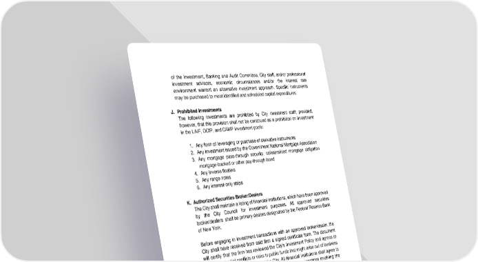 of the Investment, Banking and Audit Committee, City staff, and/or professional investment advisors, economic circumstances and/or the interest rate environment warrant an alternative investment approach. Specific instruments may be purchased to meet identified and scheduled capital expenditures. J. Prohibited Investments The following investments are prohibited by City investment staff; provided, however, that this provision shall not be construed as a prohibition on investment in the LAIF, OCIP, and CAMP investment pools: 1. Any form of leveraging or purchase of derivative instruments 2. Any investment issued by the Government National Mortgage Association 3. Any mortgage pass-through security, collateralized mortgage obligation mortgage-backed or other pay-through bond 4. Any inverse floaters 5. Any range notes 6. Any interest-only strips K. Authorized Securities Broker/Dealers The City shall maintain a listing of financial institutions, which have been approved by the City Council for investment purposes. All approved securities broker/dealers shall be primary dealers designated by the Federal Reserve Bank of New York. Before engaging in investment transactions with an approved broker/dealer, the City shall have received from said firm a signed certificate form. The document will certify that the firm has reviewed the City's Investment Policy and agrees to disclose potential conflicts or risks to public funds that might arise out of business transactions between the firm and the City. All financial institutions shall agree to undertake reasonable efforts to preclude imprudent transactions involving the City's funds. L. Use of Professional Investment Managers The City Treasurer, with approval from the City Council, may employ the services of professional investment managers to assist in the management of the City's investment portfolio. Such managers may be granted the discretion to purchase and sell investment securities in accordance with this Investment Policy. Such managers shall have: (1) an established professional reputation for asset or CITY INVESTMENT POLICY 6 of 8 COUNCIL POLICY ADOPTED 6/4/2024 132