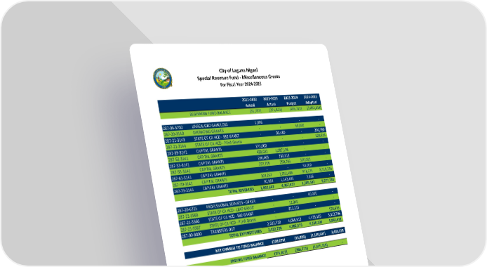 City of Laguna Niguel Special Revenue Fund ‐ Miscellaneous Grants For Fiscal Year 2024‐2025 2021‐2022 2022‐2023 2023‐2024 2024‐2025 Actual Actual Budget Adopted BEGINNING FUND BALANCE (51,737) (271,815) (286,711) (3,435,318) 287‐06‐3702 UNREALIZED GAIN/LOSS 1,996 ‐ ‐ ‐ 287‐20‐3140 OPERATING GRANTS ‐ ‐ 60,000 ‐ 287‐21‐3143 STATE OF CA HCD ‐ SB2 GRANT ‐ 93,480 ‐ 230,780 287‐21‐3144 STATE OF CA HCD ‐ PLHA Grants ‐ ‐ ‐ 528,616 287‐39‐3141 CAPITAL GRANTS 275,000 ‐ ‐ ‐ 287‐52‐3141 CAPITAL GRANTS 488,022 1,097,198 ‐ ‐ 287‐53‐3141 CAPITAL GRANTS 286,465 730,313 ‐ ‐ 287‐55‐3141 CAPITAL GRANTS 597,709 250,703 300,000 ‐ 287‐61‐3141 CAPITAL GRANTS ‐ ‐ 50,000 ‐ 287‐70‐3141 CAPITAL GRANTS 103,267 1,052,488 971,676 8,518,334 287‐79‐3141 CAPITAL GRANTS 50,183 1,143,495 7,826 ‐ TOTAL REVENUES 1,802,642 4,367,677 1,389,502 9,277,730 287‐20‐6725 PROFESSIONAL SERVICES ‐ OTHER ‐ ‐ 60,000 ‐ 287‐21‐5565 STATE OF CA HCD ‐ LEAP GRANT ‐ 12,045 ‐ ‐ 287‐21‐5566 STATE OF CA HCD ‐ SB2 GRANT ‐ 312,215 ‐ ‐ 287‐21‐5567 STATE OF CA HCD ‐ PLHA Grants ‐ ‐ ‐ 528,616 287‐99‐9000 TRANSFERS OUT 2,022,720 4,058,313 4,478,109 5,313,796 TOTAL EXPENDITURES 2,022,720 4,382,573 4,538,109 5,842,412 NET CHANGE TO FUND BALANCE (220,078) (14,896) (3,148,607) 3,435,318 ENDING FUND BALANCE (271,815) (286,711) (3,435,318) ‐ 95